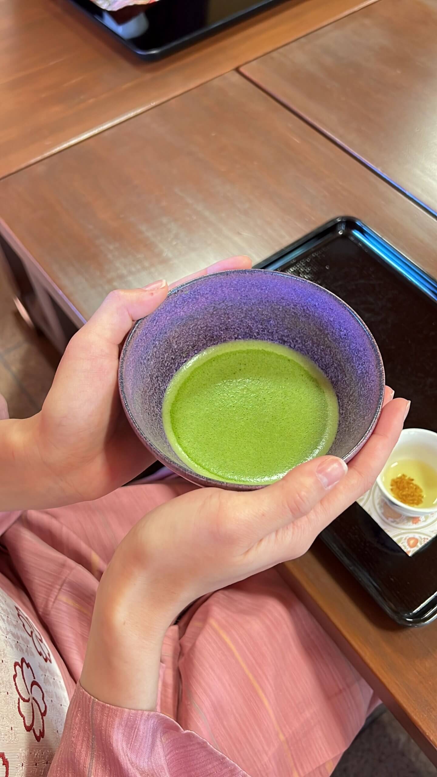 มัทฉะที่ถูกชงอย่างประณีตโดยมาสเตอร์ของร้าน กลิ่นหอมละมุน และนุ่มลึก
